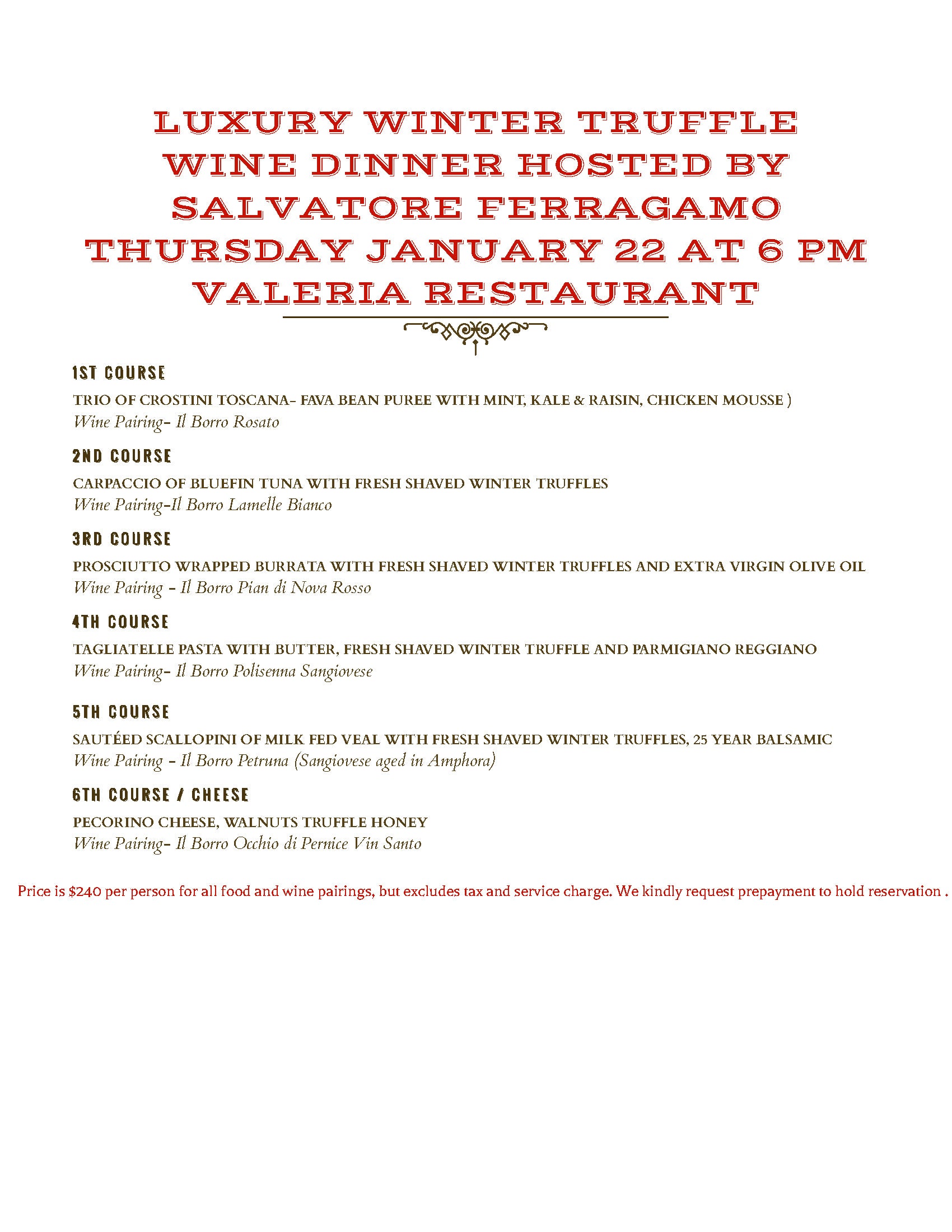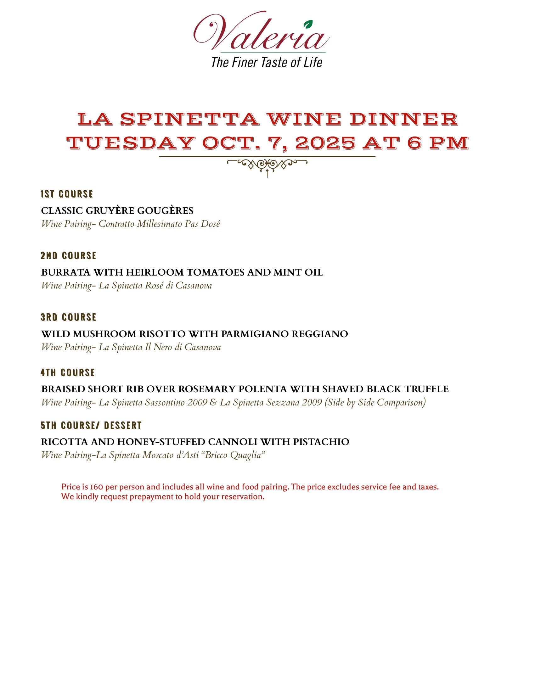 Valeria’s exclusive wine dinners offer a curated dining experience, pairing expertly crafted dishes with exceptional wines from around the world. Each event highlights unique flavors, seasonal ingredients, and carefully selected wine pairings for an unforgettable evening of culinary excellence.